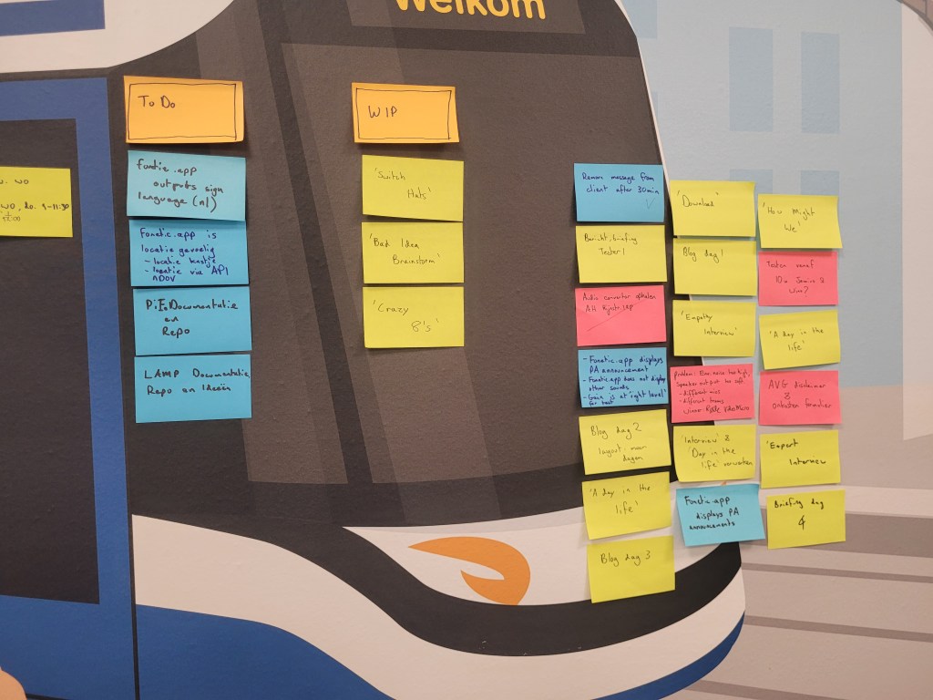 We begonnen de dag als gebruikelijk met een daily scrum – een korte meeting over wat er die dag ging gebeuren en wat we gaan uitproberen. Het gezelschap werd toen aangevuld met onze tester voor vandaag, Marja, en betrokkenen van de HvA en GVB. Het was extra speciaal dat iedereen ook al in de vooronderzoeken betrokken was geweest bij Fonetic en nu kon bijdragen aan de ontwikkeling. We hadden voor deze gelegenheid ook gebruik van de oude kantine, een hele prettige en veel grotere ruimte. Goed voor de creatieve gedachten voor de ‘Crazy 8s‘ die we samen deden.